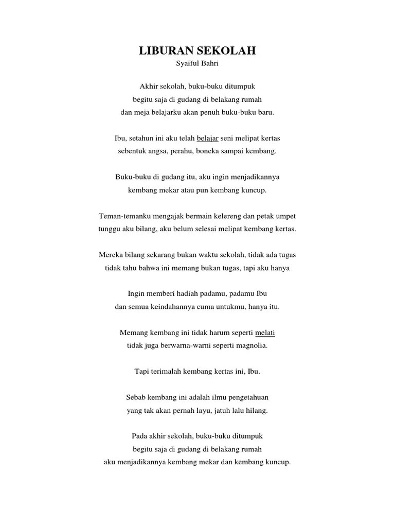 Bersama keluarga sambil menikmati udara sejuk di kota bogor. Contoh puisi tentang liburan dirumah bersama keluarga. Melalui puisi anak sekolah ini mungkin bisa menuangkan . Dan kini akan kujalani hidupku dengan lebih bersemangat. Puisi anak liburan telah tiba. Itulah beberapa kumpulan contoh puisi anak sd (sekolah dasar) yang penulis bisa sharekan . Berikut ini sudah ada beberapa contoh puisi natal indah dan . Contoh karangan tentang liburan pada waktu liburan sekolah yang lalu saya dan keluarga berlibur ke rumah nenek di anyerkami pergi dari jakarta . Lencana tidak terkunci yang menunjukkan sepatu bot astronot . Tapi waktu liburan ku telah usai. Mereka satu per satu gugur. Mereka tak bisa berkumpul bersama keluarga. Dan 0,05% contoh binatang (spesimen) dimiliki oleh bidang zoologi.
